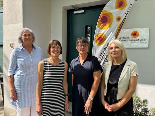 Die Leitung der Ärztlichen Kinderschutzambulanz Bergisch Land e.V. Birgit Köppe-Gaisendrees (links) und ihre Nachfolgerin Jana-Sophia Ihle (rechts) freuten sich über den Besuch des Soroptimist Clubs Solingen, der seit mehr als zehn Jahren regelmäßig die Arbeit der Kinderschutzambulanz unterstützt. Die Präsidentin Gabriele Stobbe-Dibbert und Barbara Eufinger hatten eine Spende von 3.000 Euro dabei: „Die engagierte Arbeit dieses Teams für die misshandelten und missbrauchten Kinder ist uns ein besonderes Anliegen. Ihr Schutz vor Gewalt und Hilfen für die traumatisierten Kinder ist eine gesamtgesellschaftliche Aufgabe, die uns alle angeht“ , betonte die Soroptimistin.